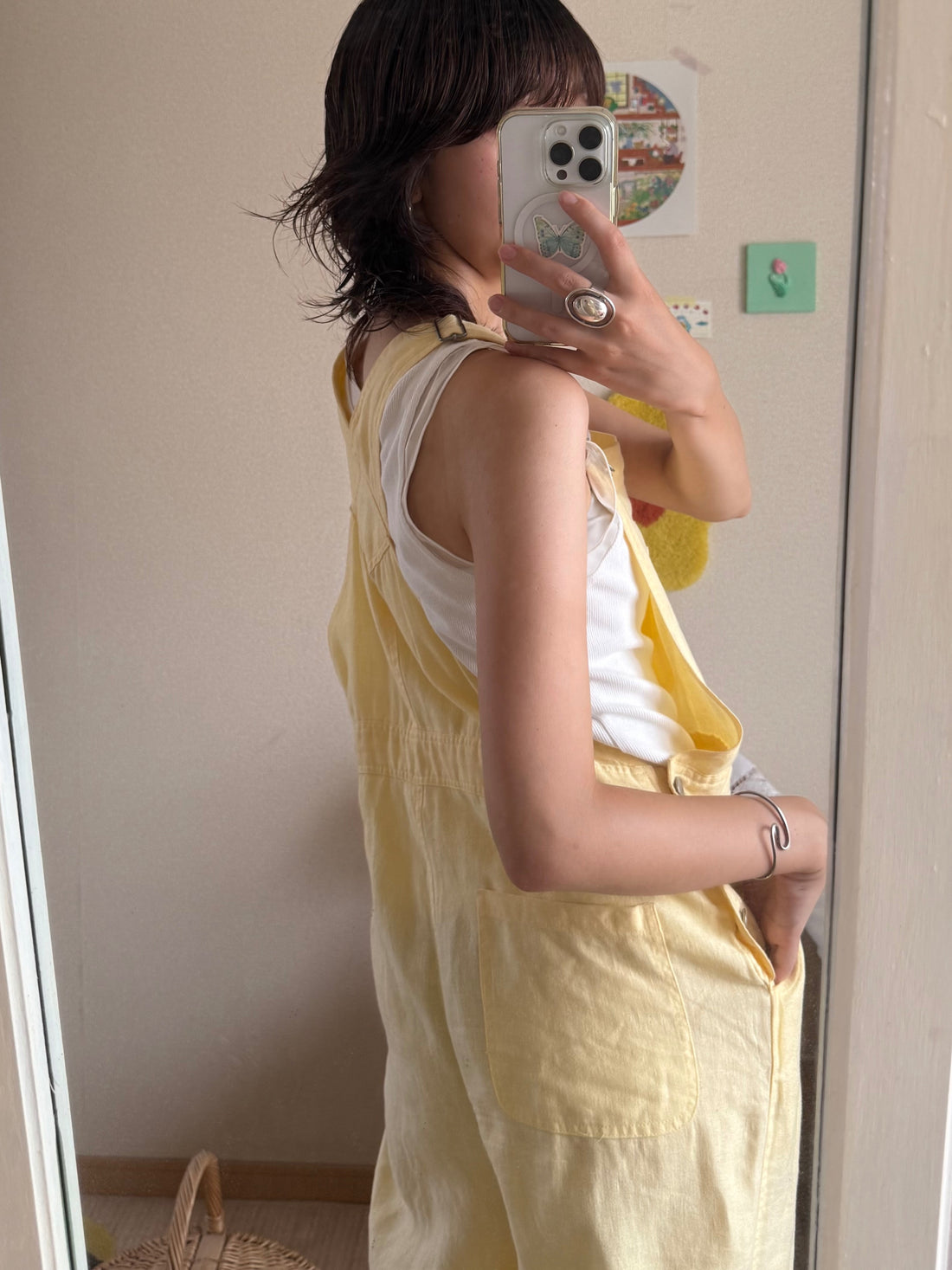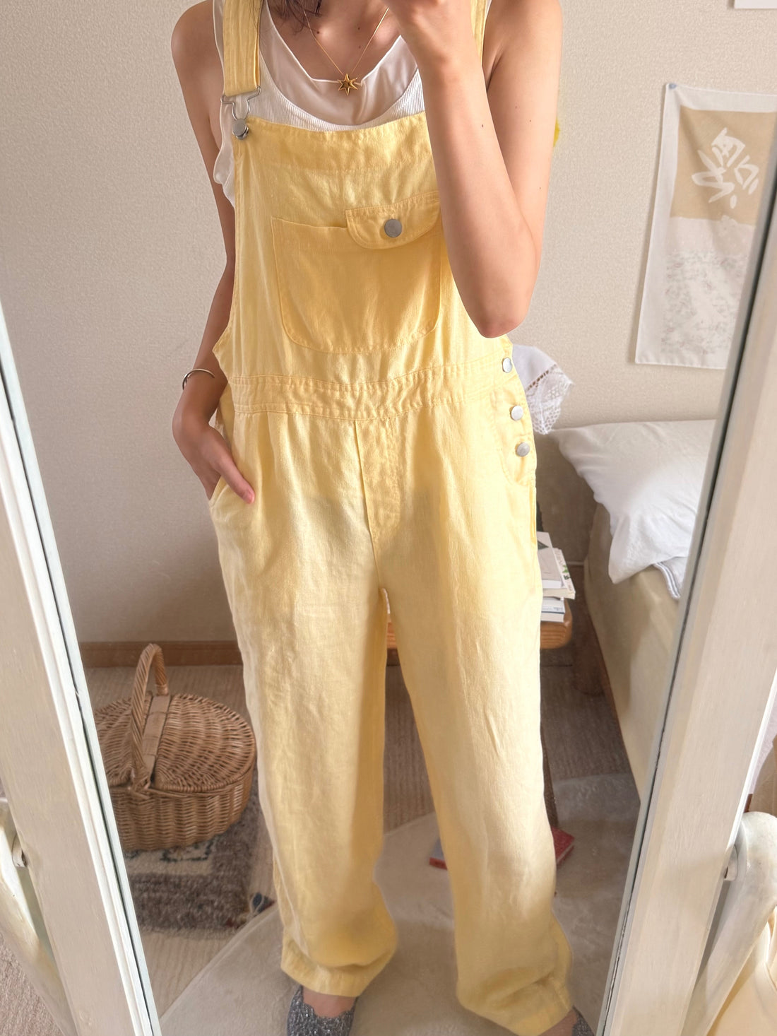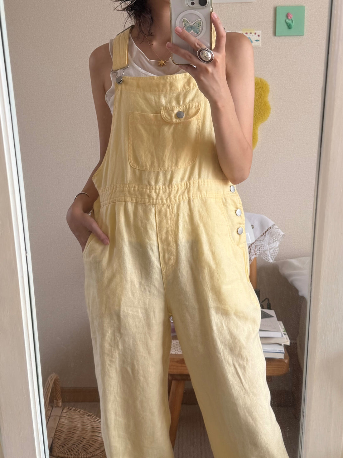 ヴィンテージのサロペット。コットン素材ですが柔らかく優しいイエローです。メンズの古着屋さんで買ったのですがレディースが着て少しゆとりのあるサイズ感が気に入っていました。これからの季節は下にスウェットやTシャツを合わせてゆるっと着るのがおすすめです🍋丈が長めなので私と同じ身長162cm以上の方か厚みのある靴を履くのが良さそうです◎