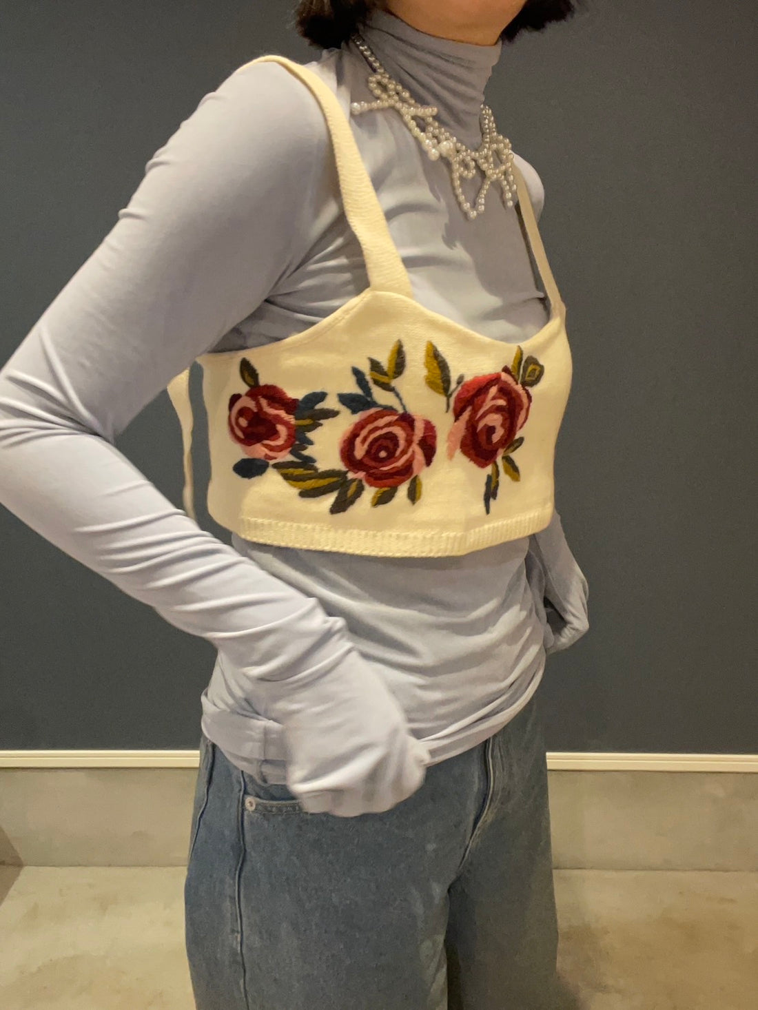 큰 장미 패턴을 가진 귀여운 니트 버스타.